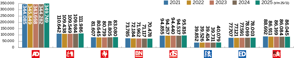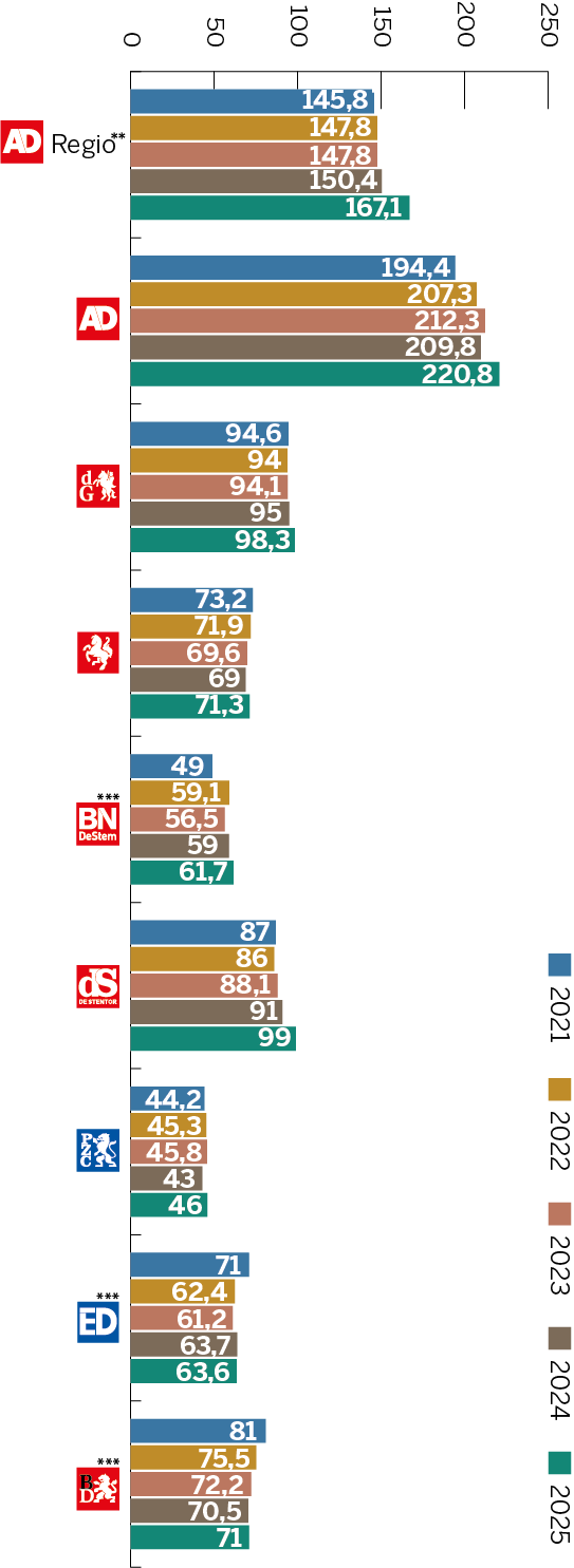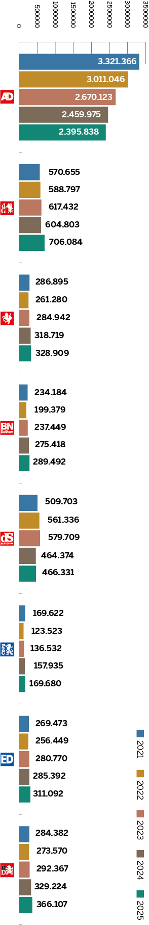 Dit is de som van papieren, digitale en hybride abonnementen. Het is het gemiddelde aantal over het desbetreffende jaar.